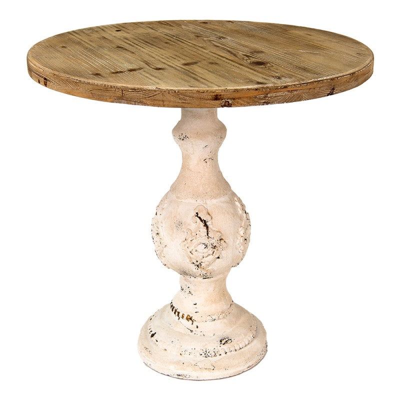 Giv din indretning et rustikt og charmerende udtryk med dette smukke sidebord med dekorativ fod. Bordet kombinerer en rund bordplade i naturligt træ med en kunstfærdigt dekoreret fod i antik hvid finish, hvilket skaber et elegant og tidløst look.