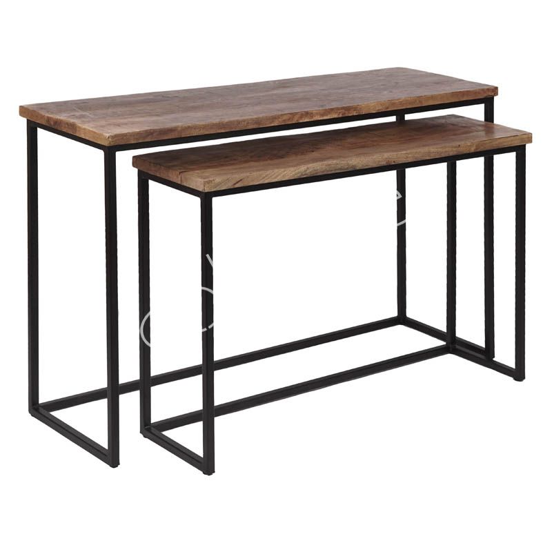 Dette elegante sæt af 2 konsolborde kombinerer naturligt mangotræ med et minimalistisk sort metalstel. Bordpladerne er fremstillet i massivt mangotræ, som giver en varm og rustik overflade med unikke åremønstre, mens stellet i sort pulverlakeret metal tilfører et industrielt og moderne udtryk.