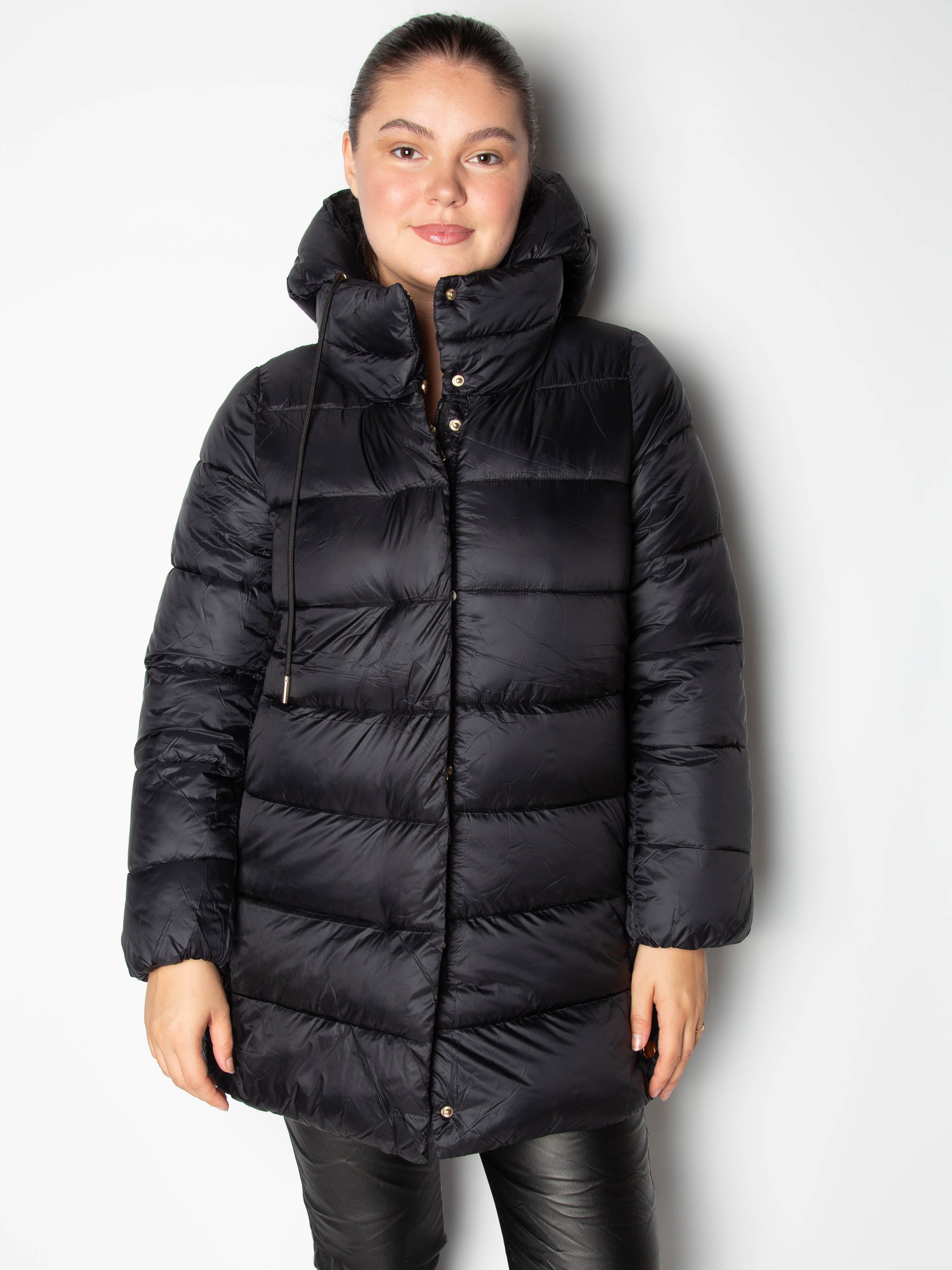 Modellen er 169 cm høj og bruger normalt en størrelse 40 i denne jakke bruger hun en str. XL.