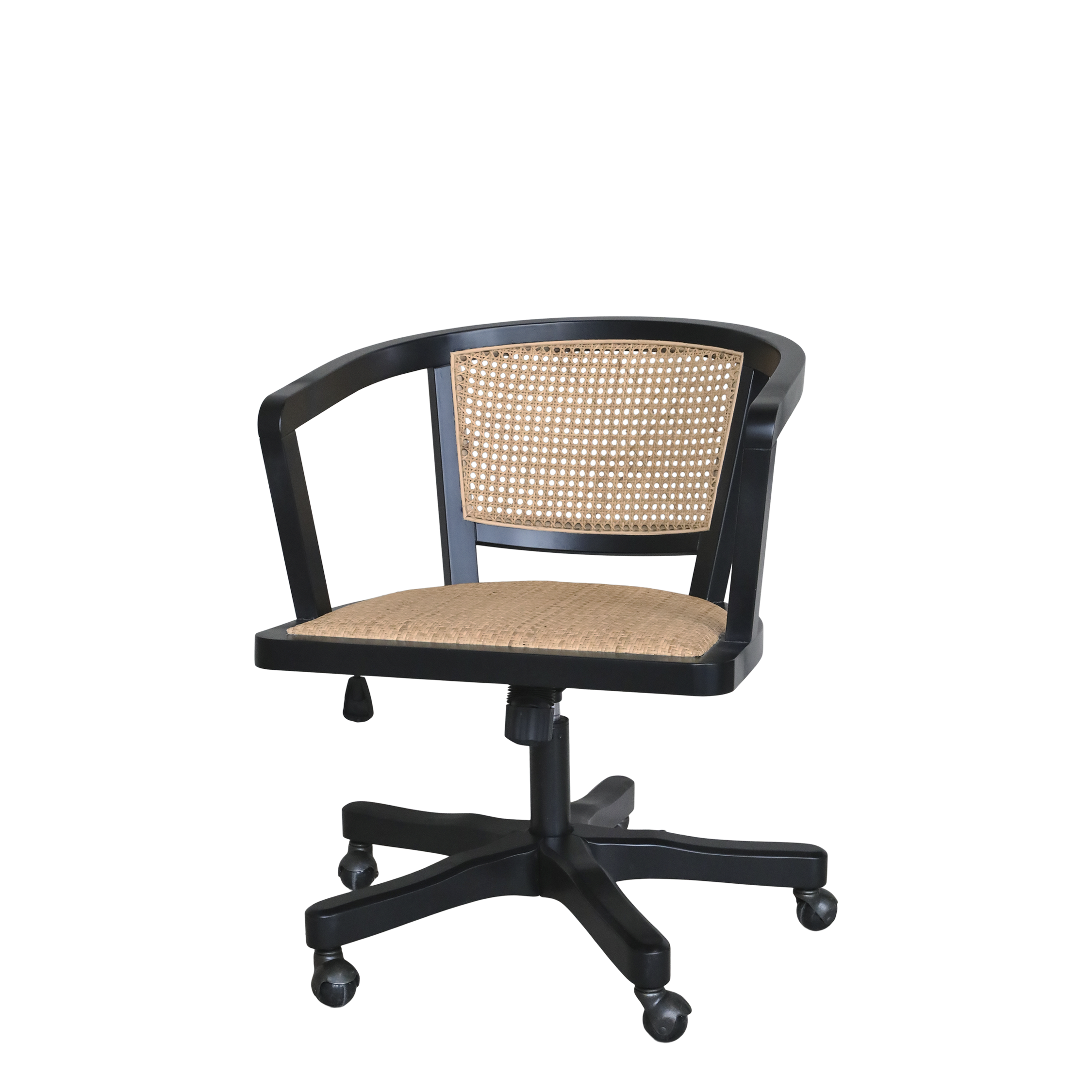 En elegant fransk-inspireret kontorstol, der forener klassisk design med funktionalitet. Stolen har et smukt fletsæde og flettet ryg, der giver et let og luftigt udtryk, mens den antique sorte ramme tilfører karakter og kontrast.
