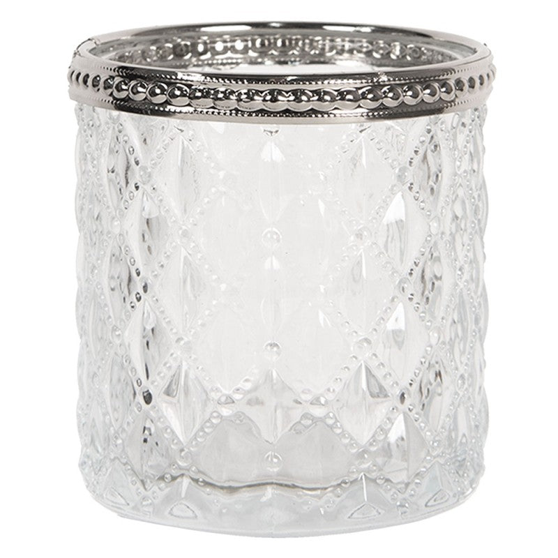 Skab en hyggelig og elegant stemning i hjemmet med denne smukke glas fyrfadsstage. Stagen er fremstillet i klart glas med et flot mønstret design og detaljeret sølvkant, som reflekterer lyset smukt og tilføjer et strejf af luksus.