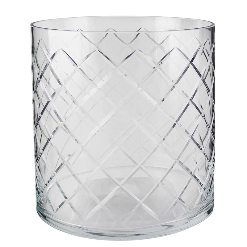 En elegant hurricane i klart glas med smukt slebet mønster, der skaber et eksklusivt og stemningsfuldt udtryk. Det fine mønster reflekterer lyset på dekorativ vis, når du placerer et bloklys eller fyrfadslys indeni.