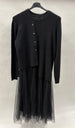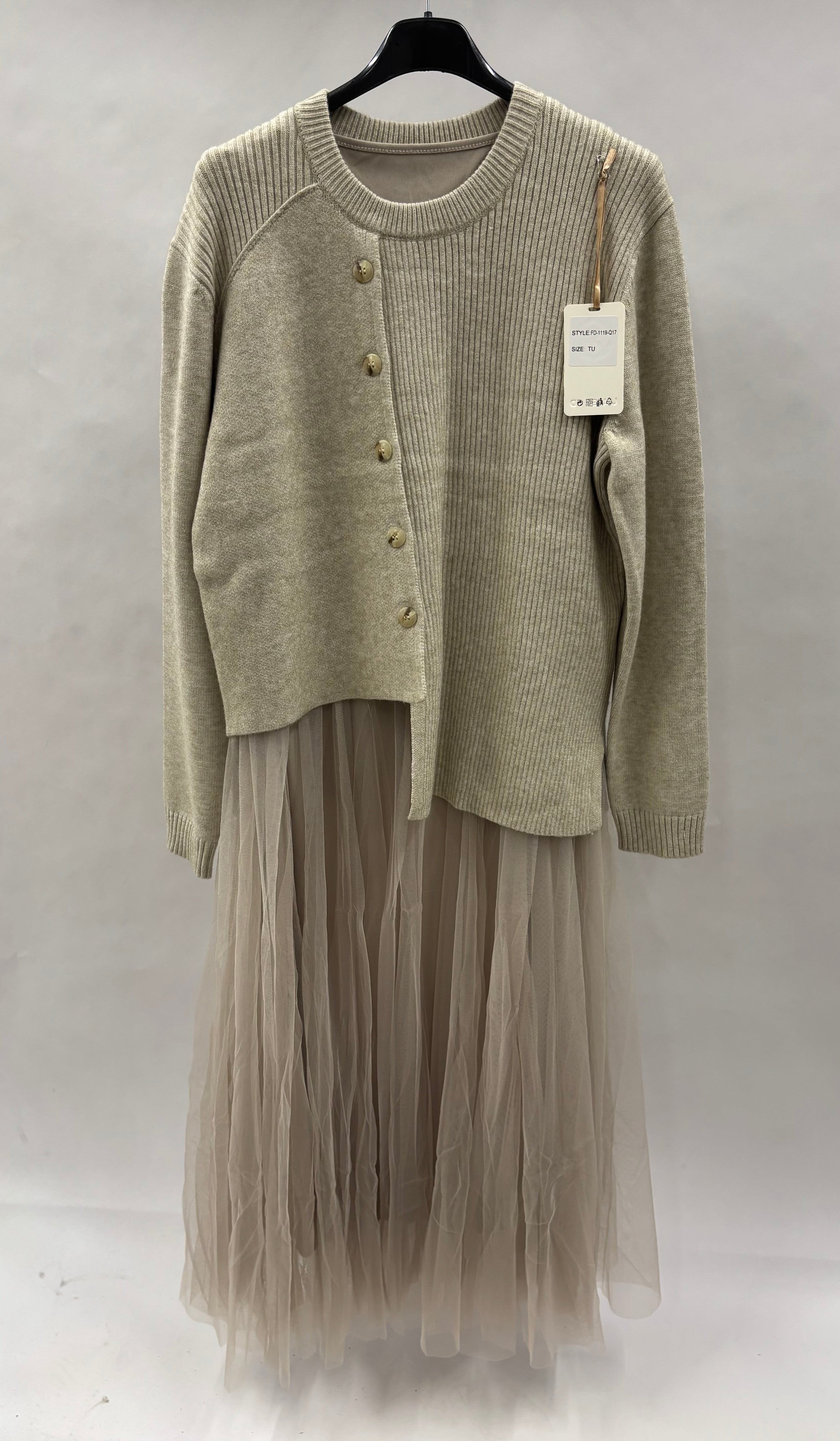 Skab et romantisk og elegant look med denne smukke kjole med underdel i tyl og separat cardigan. Kjolens tylskørt giver et let, luftigt og feminint udtryk, der falder flot og skaber bevægelse. Overdelen kombineres med en matchende cardigan, som kan bæres åben eller lukket alt efter stil og anledning.