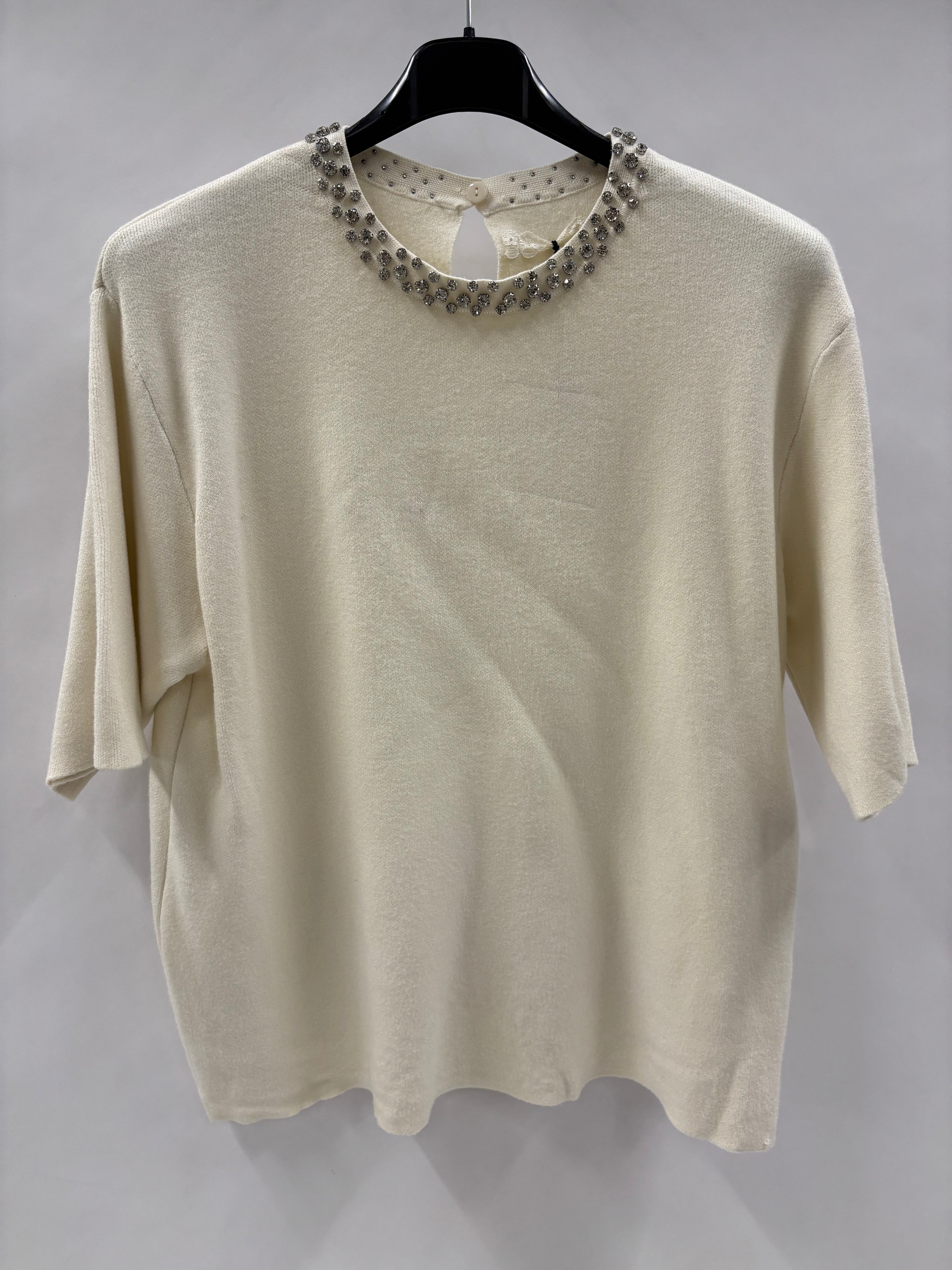 Kortærmet Strikbluse med Sten i Halsen – Elegant, Feminint og Komfortabelt