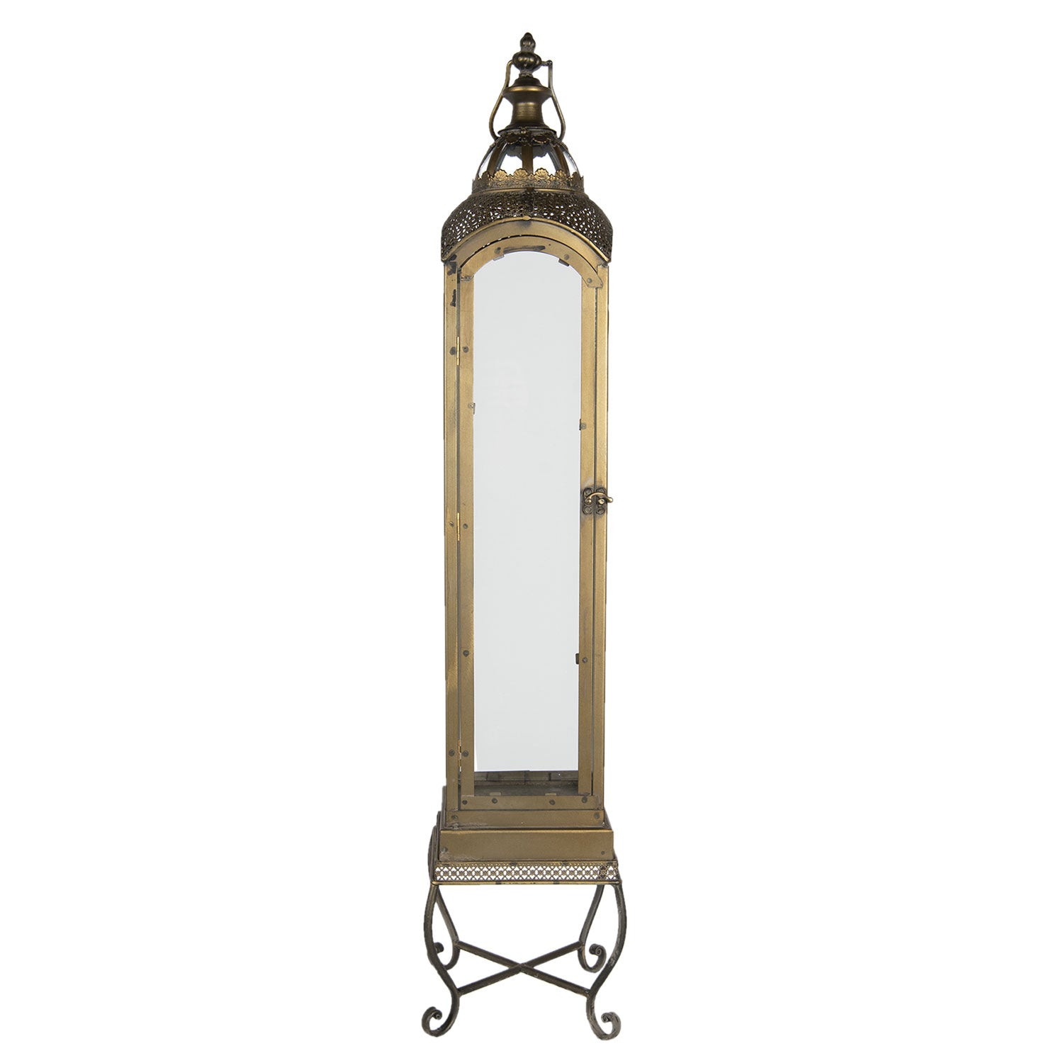 Lanternen er fremstillet i metal med glasflader, der lader lyset skinne smukt igennem. Den gyldne finish giver et eksklusivt udtryk, som passer perfekt til både moderne og klassiske hjem. Med målene 18 x 18 x 90 cm er den ideel som gulvlanterne i stue, entré eller på terrassen.