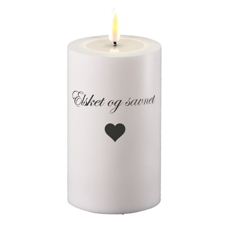 Et smukt og stemningsfuldt LED gravlys med teksten "Elsket og savnet" samt et hjerte-symbol. Dette lys er skabt som en kærlig og værdig måde at mindes en elsket på, og det spreder varme og ro, hvor det placeres – både på gravstedet og i hjemmets mindehjørne.