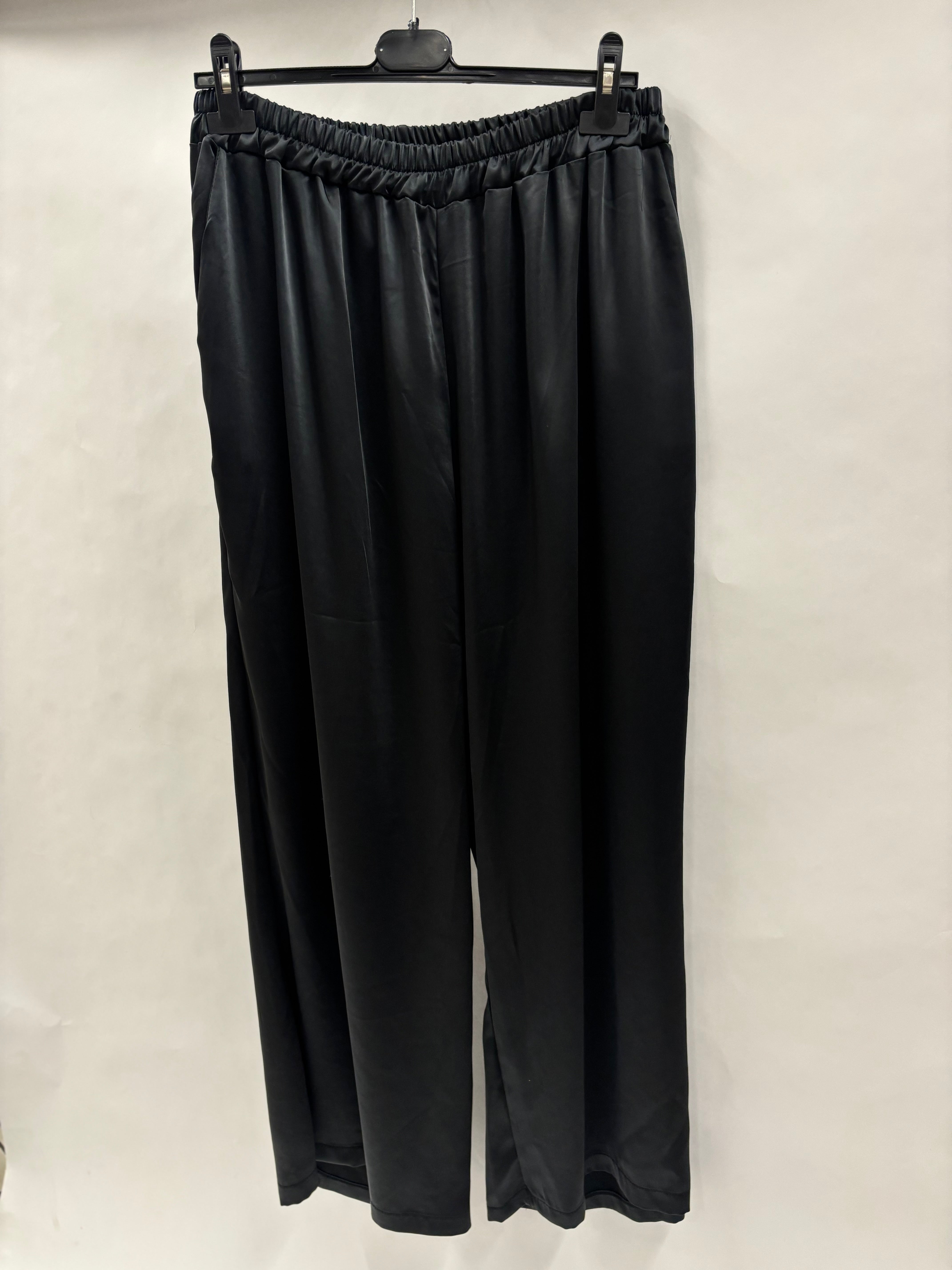 Opgrader din hverdagskomfort med disse elegante silkeagtige bukser, der kombinerer lethed, luksus og perfekt pasform. Det glansfulde materiale giver et eksklusivt look, mens de brede ben skaber en smuk og flydende silhuet, der klæder alle kropstyper.