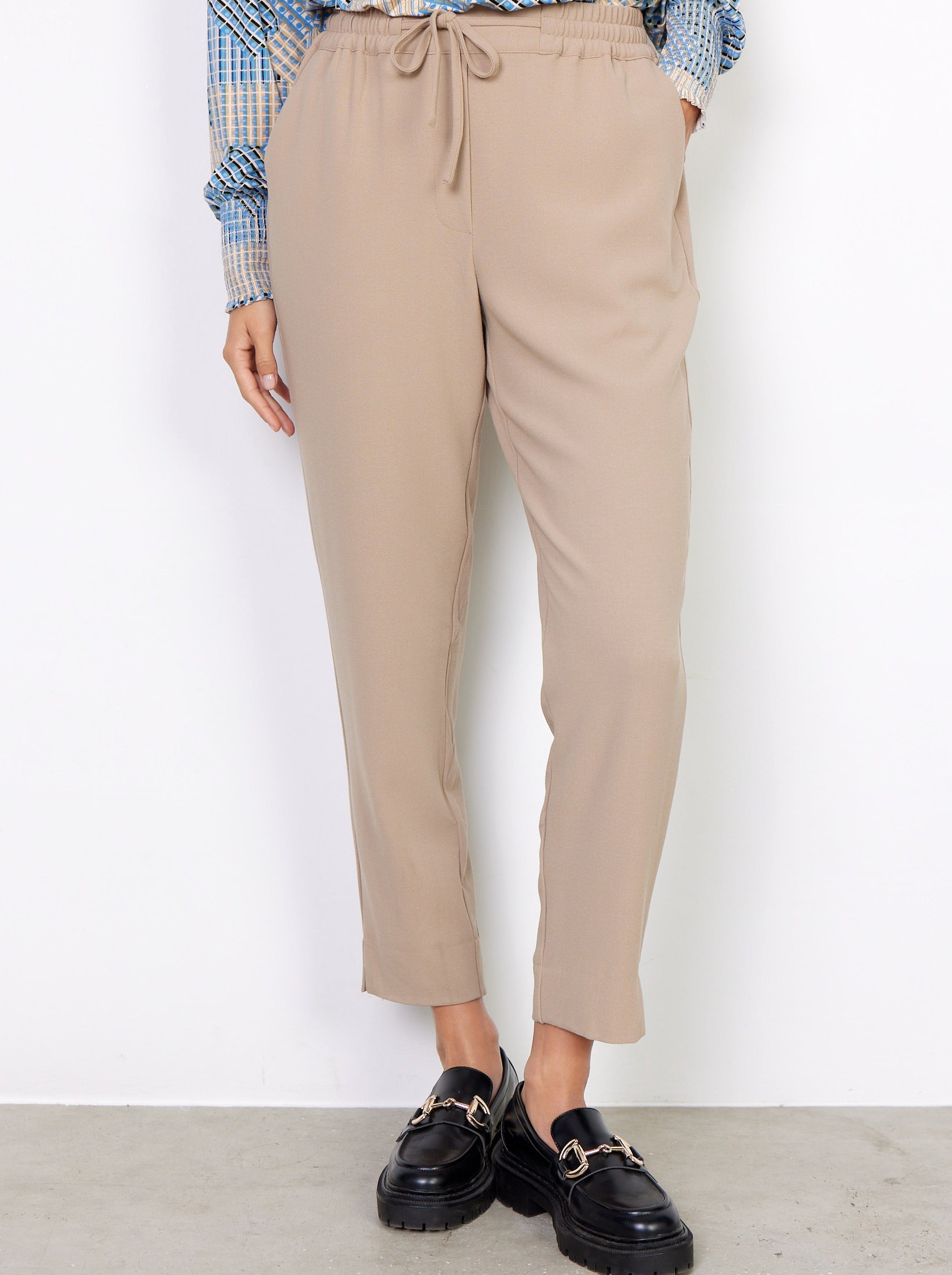 SC-Jutta 1-b er et par behagelige bukser i en genanvendt polyester og viskose kvalitetsblanding. De har elastik og bindebånd i taljen, tre lommer og en løs pasform. Style disse bukser med en farverig bluse for et flot forårslook.