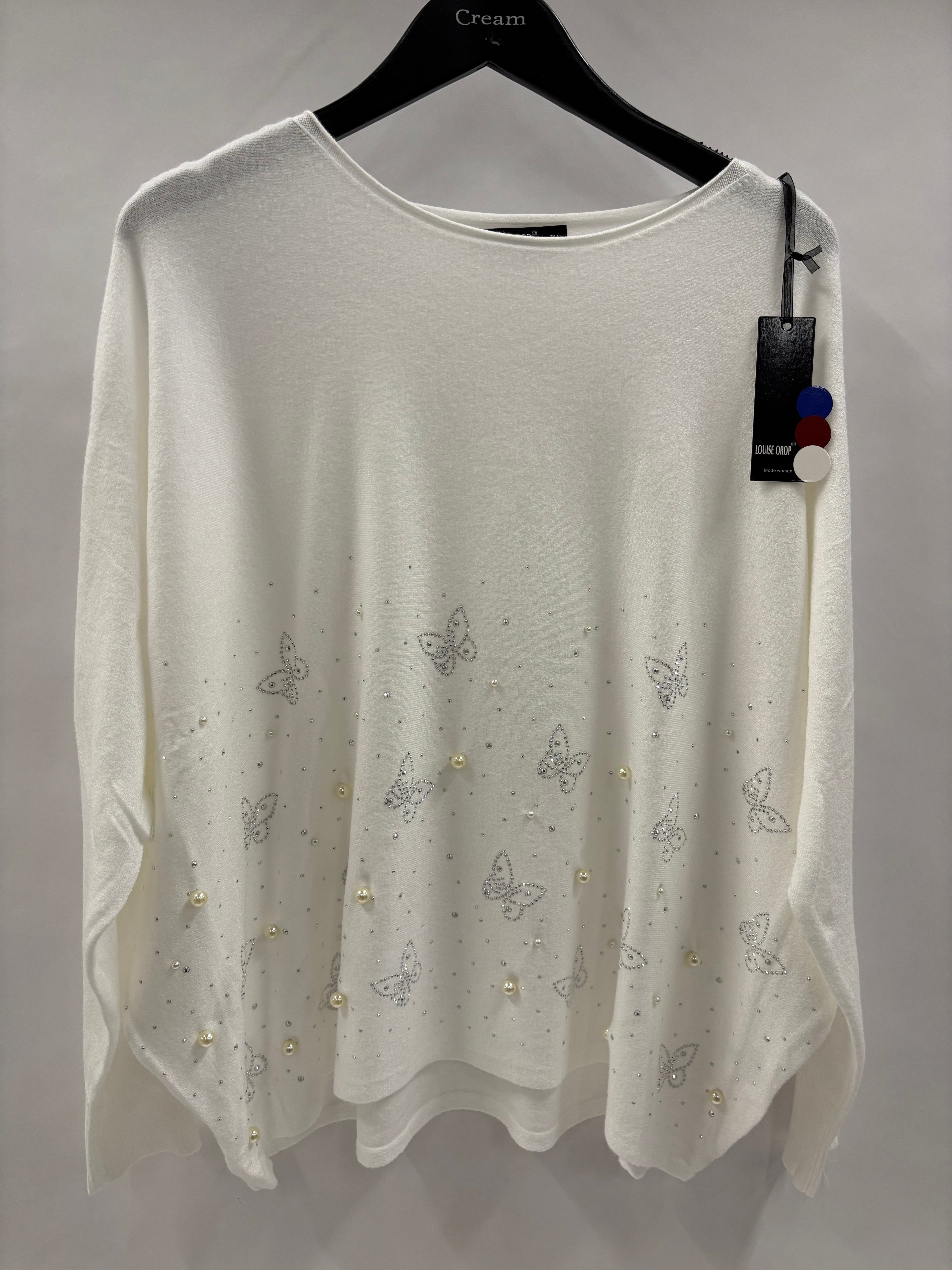 Denne langærmede strikbluse med smukke sommerfuglemotiver er den perfekte kombination af komfort og charme. Det detaljerede sommerfugledesign giver blusen et feminint og legende udtryk, mens den bløde strikkvalitet sikrer maksimal komfort hele dagen.