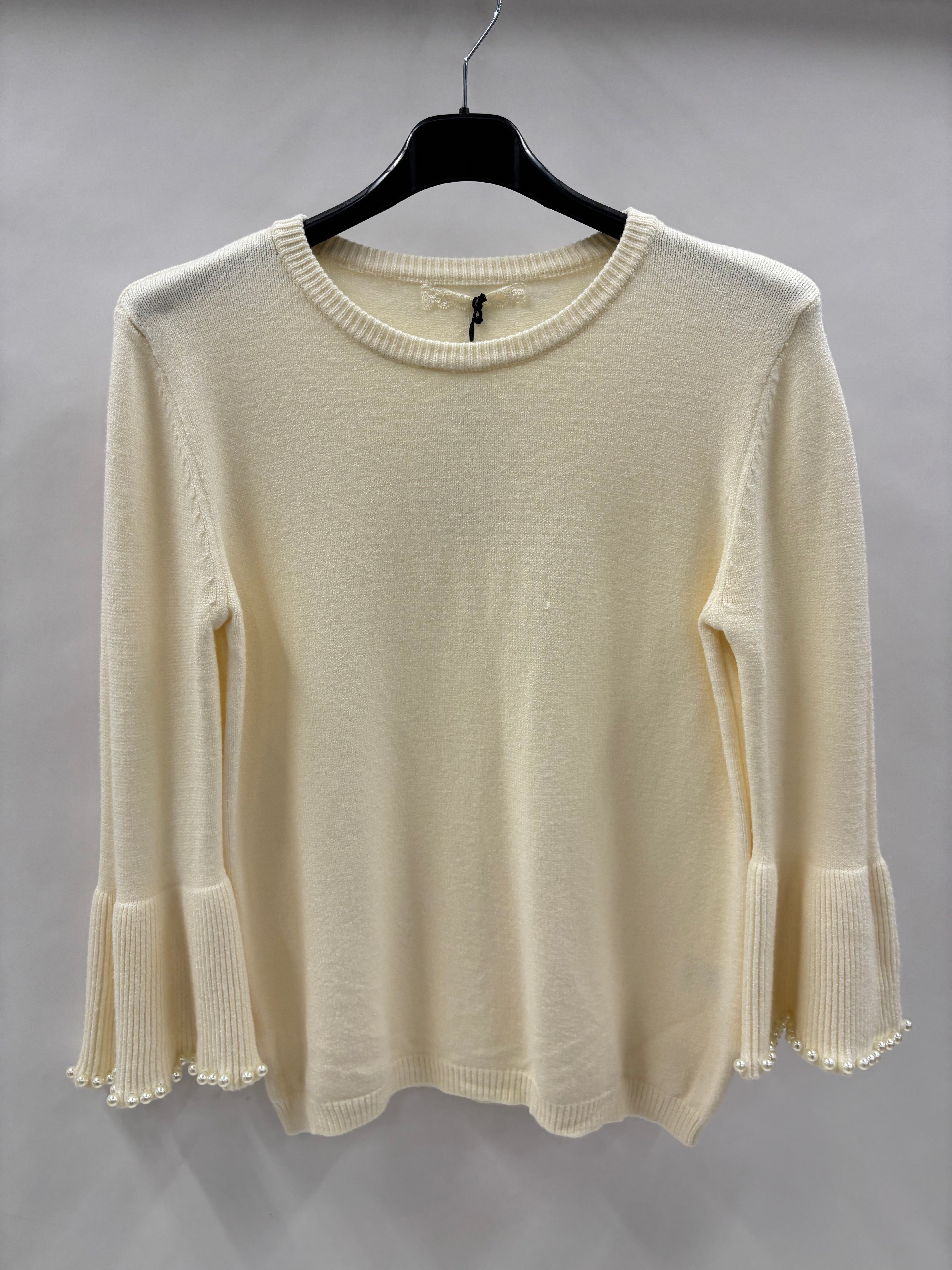 Tilføj et tidløst og feminint element til din garderobe med denne smukke cremefarvede strikbluse, dekoreret med en elegant perlekant. Den fine perlebesætning giver blusen et eksklusivt og sofistikeret look, mens den bløde strikkvalitet sikrer høj komfort hele dagen. Blusen er perfekt til både hverdag og festlige lejligheder, hvor du ønsker et stilfuldt, men diskret touch.